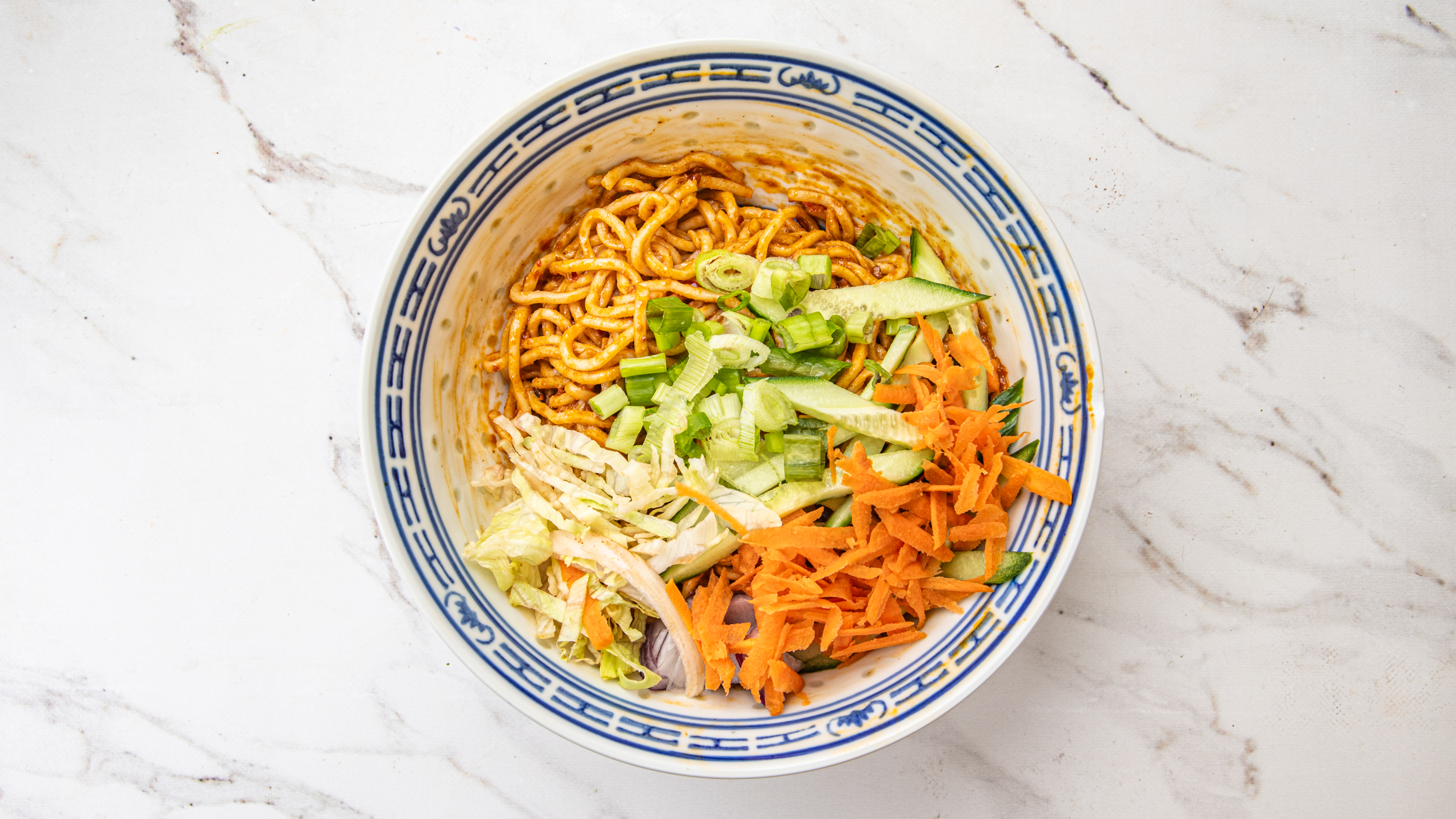 Hausgemachte frishe Nudeln, Eisbergsalat, Zwiebel, Lauchzwiebel, Sojasauce, Salz