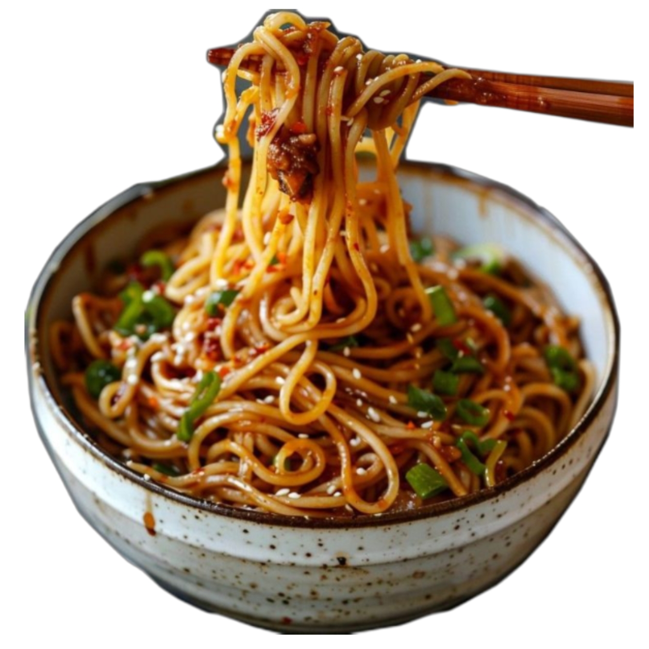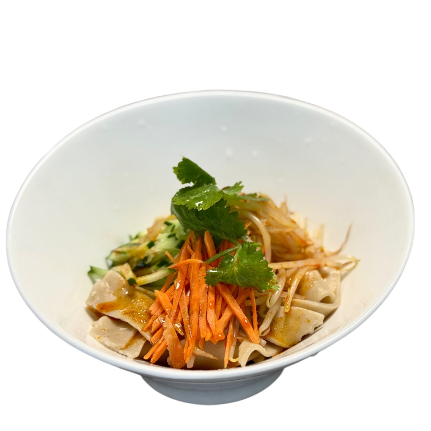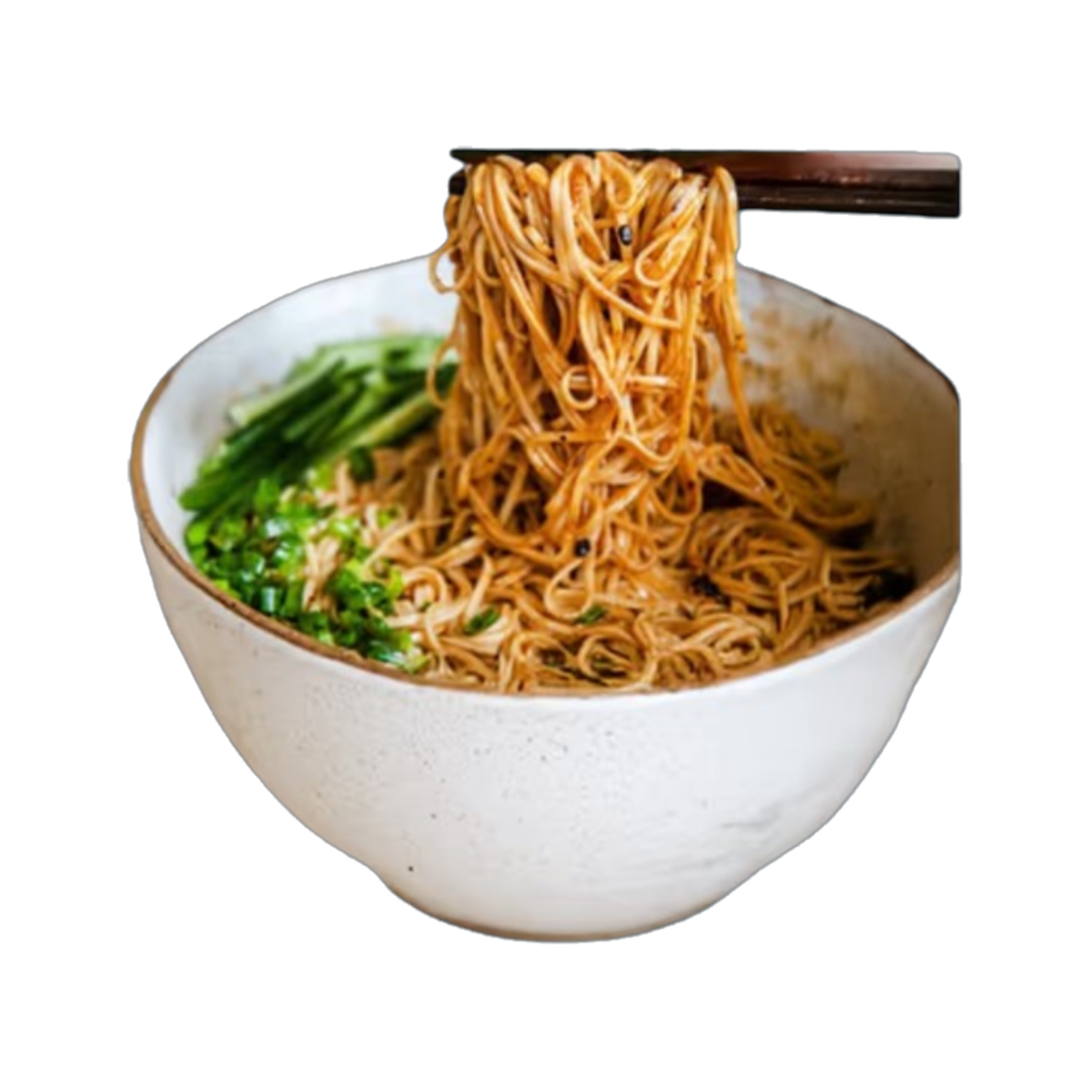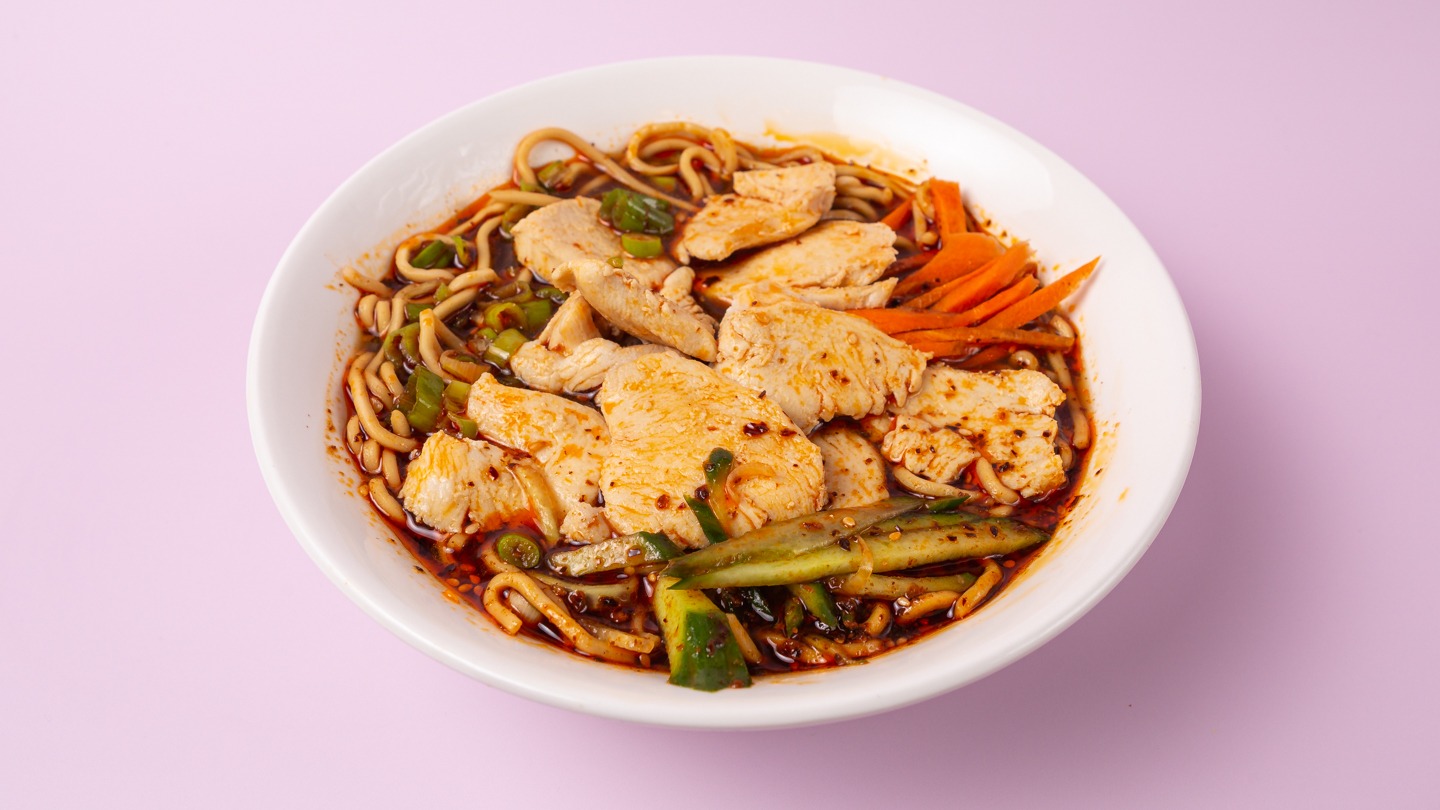 Hausgemachte frishe Nudeln, Schweinefleisch, Chili, Sojasoße, Lauchzwiebel, Ingwer, Gurke, Sojasprossen.