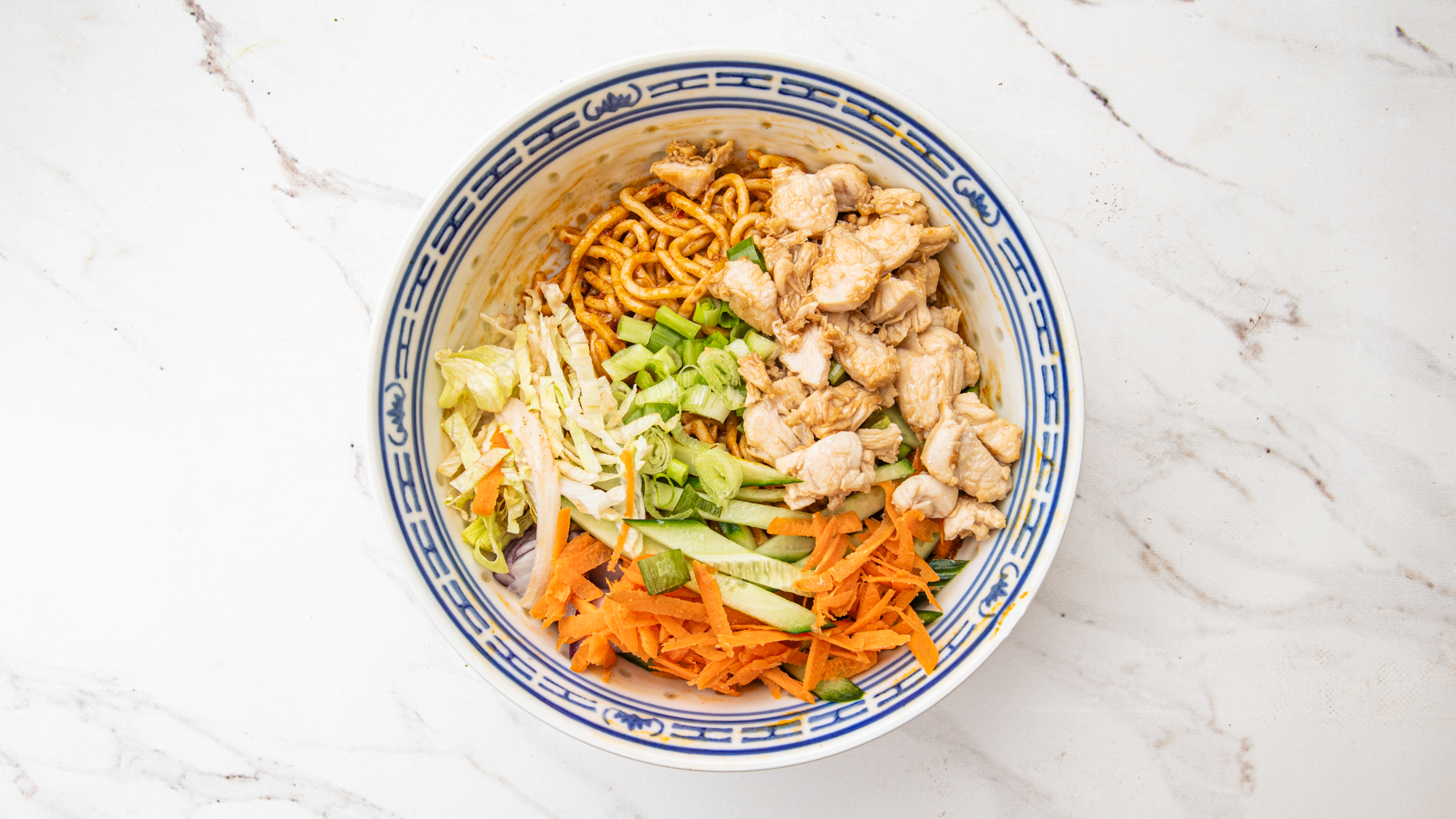 Hausgemachte frishe Nudeln, Eisbergsalat, Zwiebel, Lauchzwiebel, Sojasauce, Salz, Hühnerfleisch